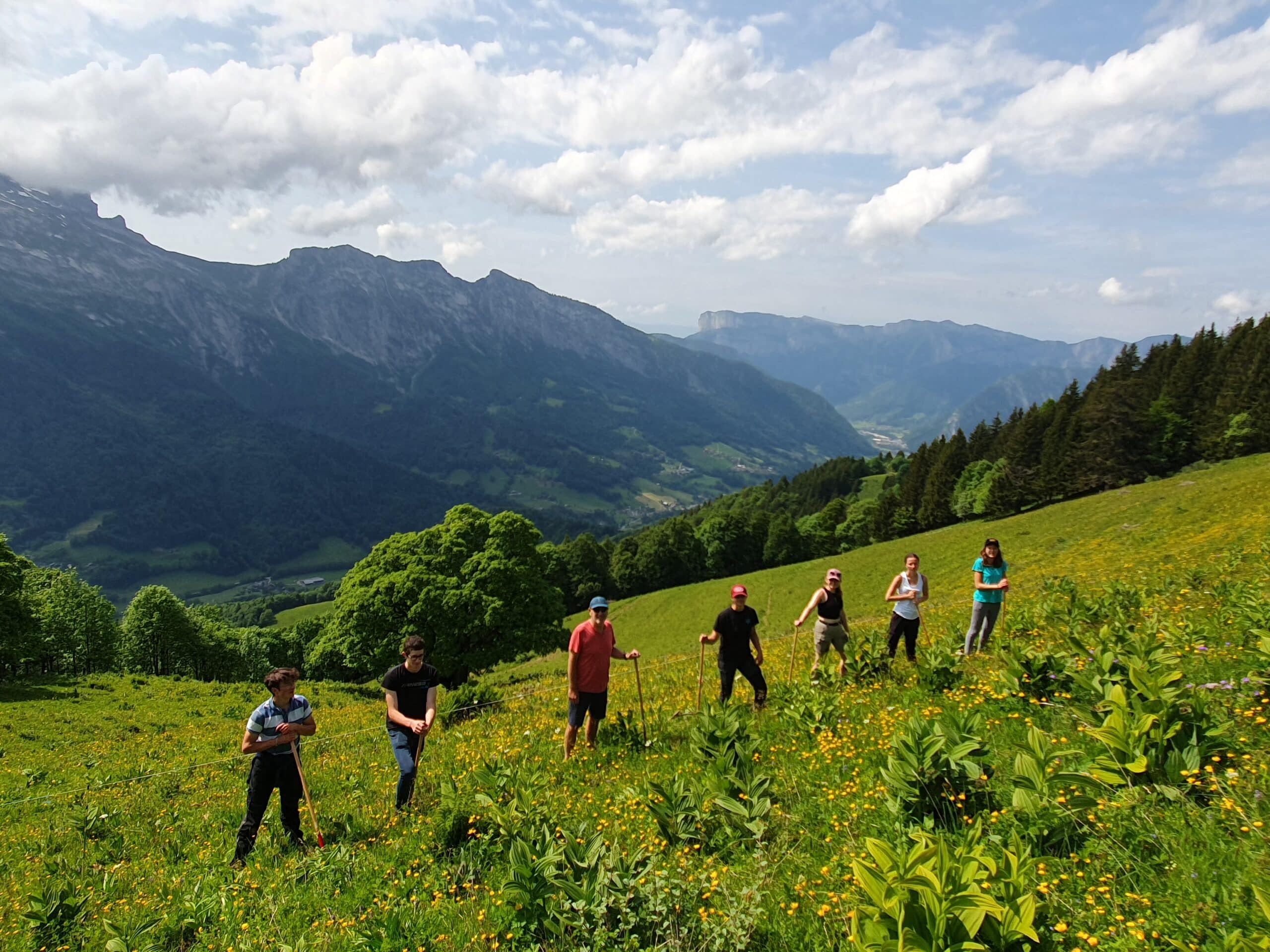 • Fauche de plantes invasives : encadrés par Constance, bergère recrutée pour l’été par le lycée, qui monte un troupeau d’Abondances.