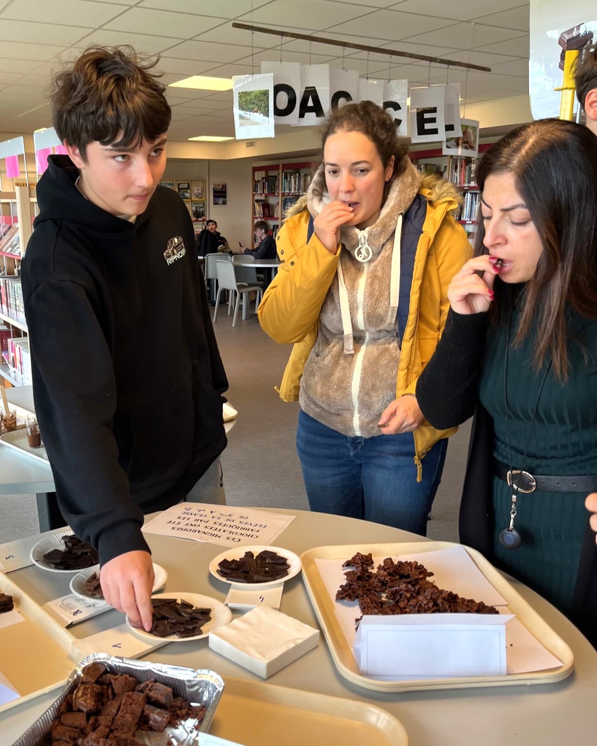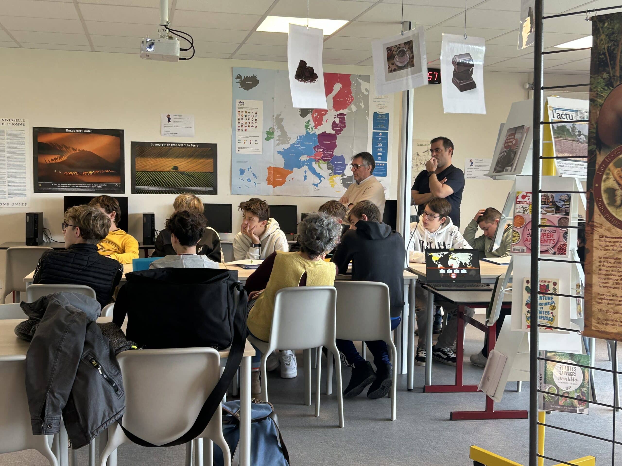 Au-delà de l’aspect culinaire, ce projet s’inscrivait dans une démarche pédagogique complète. Plusieurs classes de l’établissement sont ainsi venues au CDI pour découvrir une exposition thématique sur le cacao, prêtée par La Turbine.