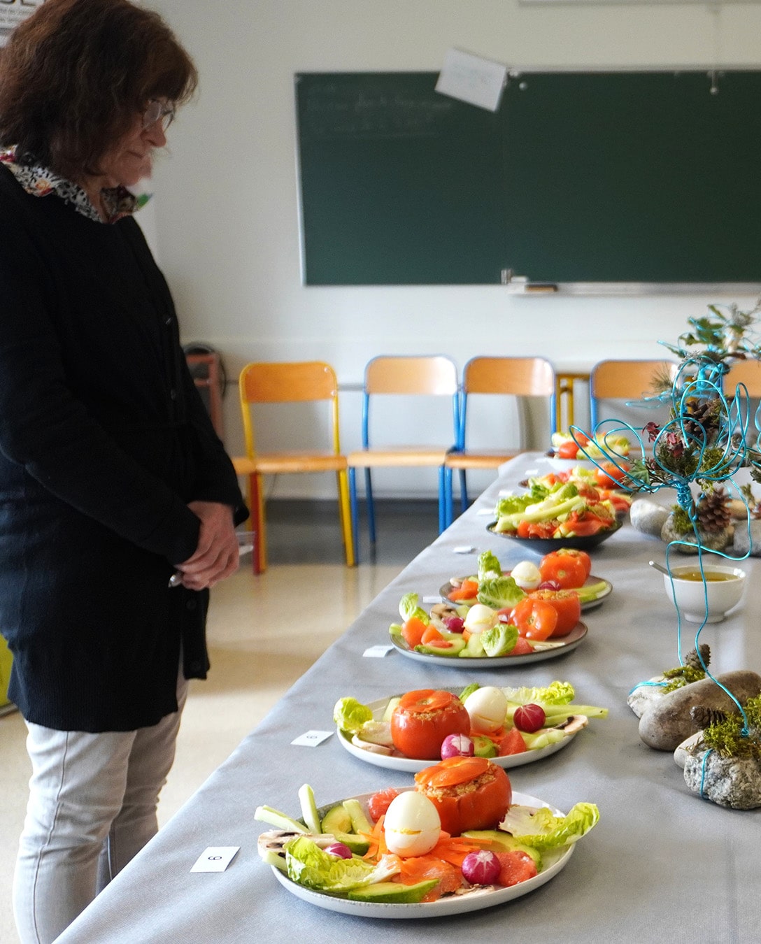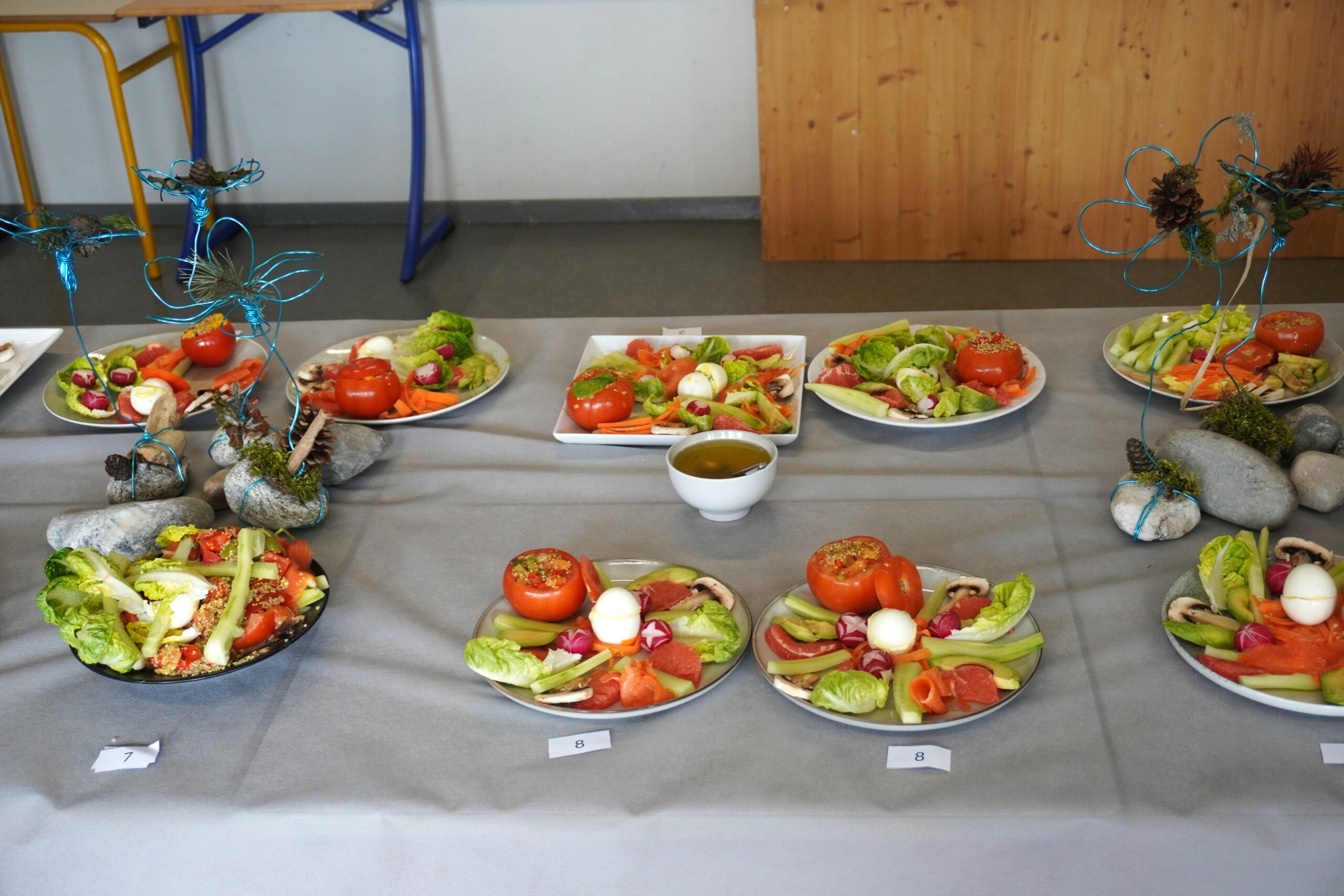 Les élèves ont réalisé une entrée composée champêtre avec œufs et tomate farcie au quinoa. Cet exercice permet d’évaluer la capacité des apprenants à préparer un repas équilibré tout en respectant les règles d’hygiène et d’organisation en cuisine.