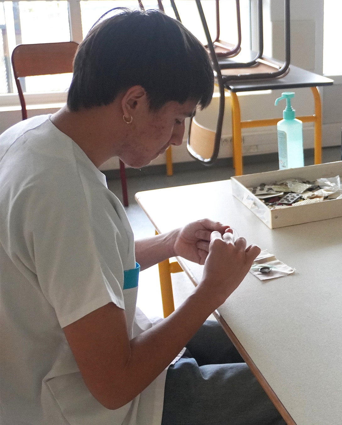 Enfin, un atelier couture demandait précision et minutie : coudre des boutons sur une chemise, une activité qui peut être utile dans l’accompagnement du quotidien.