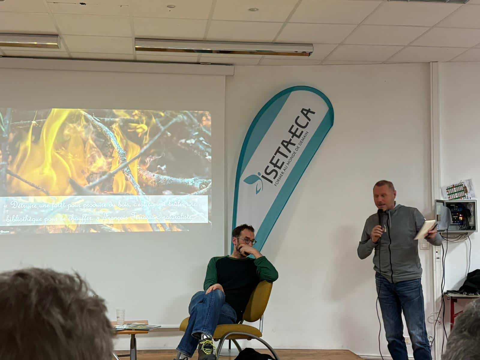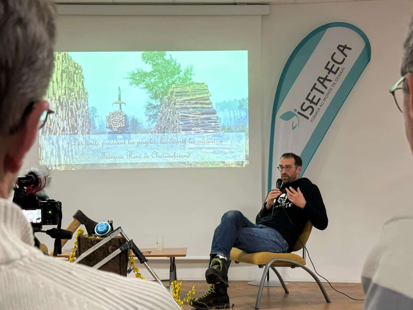 Une chance aussi pour les étudiants de BTSA Gestion Forestière temps plein 2ème année qui ont, dans un exercice pédagogique intéressant, travaillé à cette conférence, mettant en place la salle, imaginant un scripte et les questions, introduisant l’intervention de Sylvain en rappelant son parcours mais aussi l’importance de pouvoir encore débattre aujourd’hui…